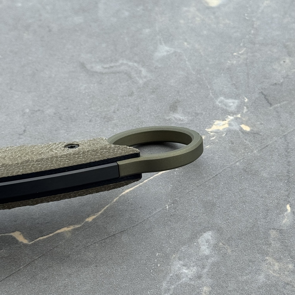 - Steel: Vanadis 23 (~61-62 HRC), black DLC coating (~90 HRC) + titanium finger ring green anodized