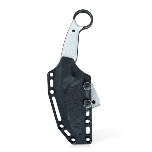 Presented MK Knives & Tools Claw “Grey Storm” has a blade made of premium Elmax steel, with innovating hollow grind (characteristic grooves on the blade) and fuller. Blade was covered by excellent DLC coating. Handle scales are made of grey G10 composite. The knife has a black kydex holster. Kydex can be mounted vertically or horizontally or at a selected angle thanks to a specially adapted grey kydex buckle.