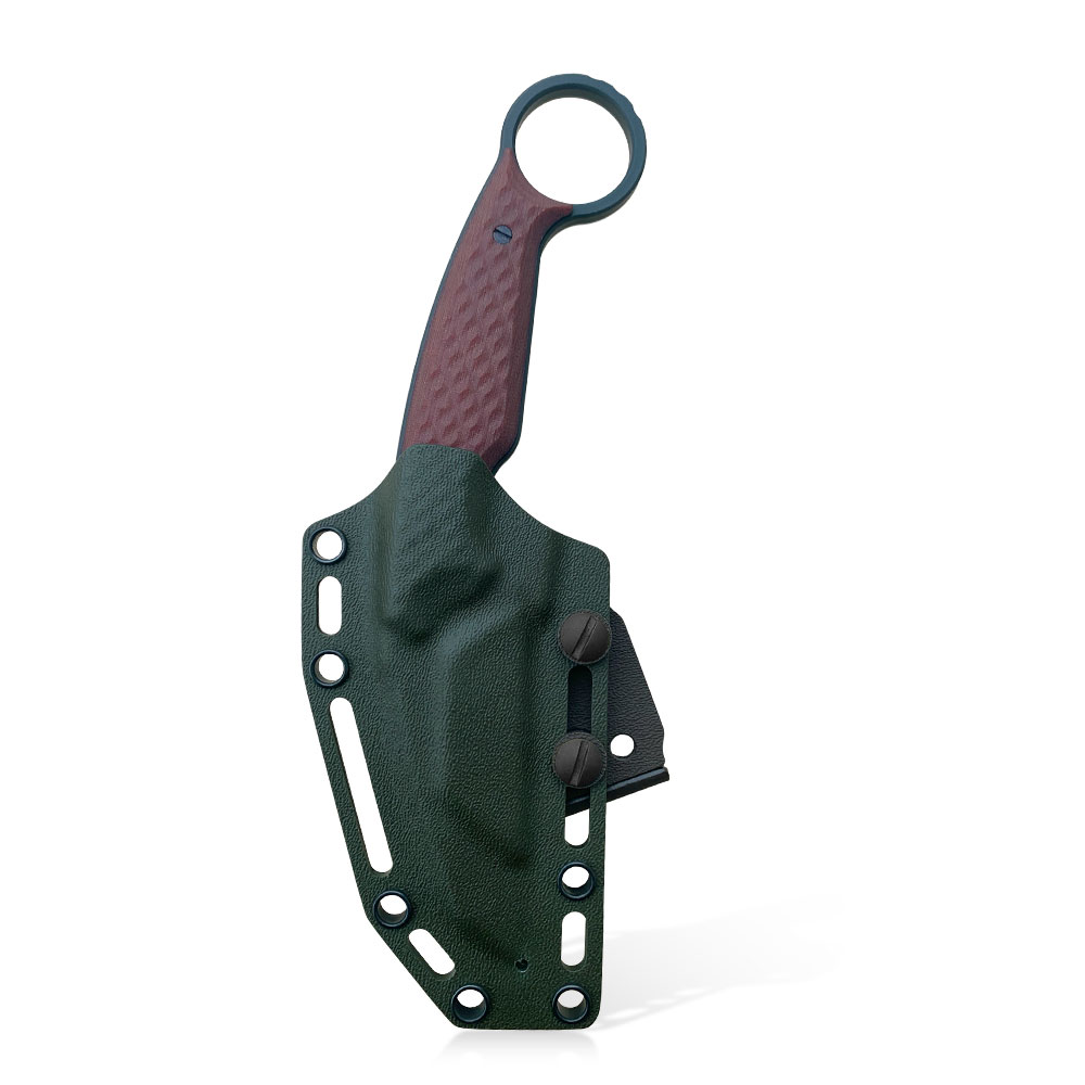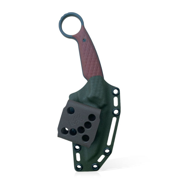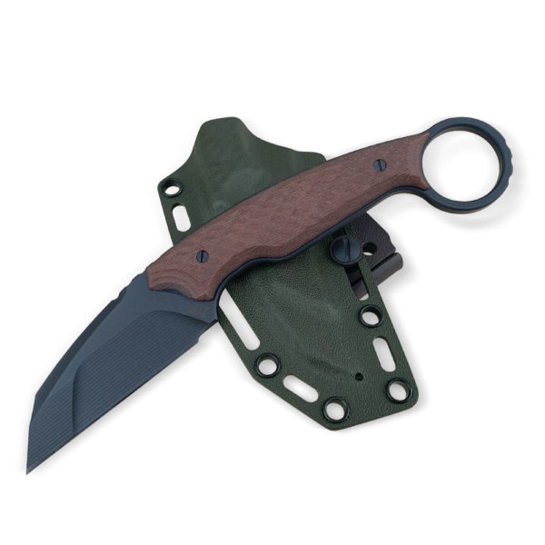 Presented MK Knives & Tools Claw “Real Brown” | Vanadis 4 Extra | PVD has a blade made of premium Vanadis 4 Extra steel, with a very interesting double grind (characteristic grooves on the blade). The blade has titanium PVD coating. Handle made of brown micarta (high density) has additional liners made of black G10 composite. The knife has an olive-colored kydex holster. Kydex can be mounted vertically or horizontally or at a selected angle thanks to a specially adapted kydex buckle (chocolate brown color).