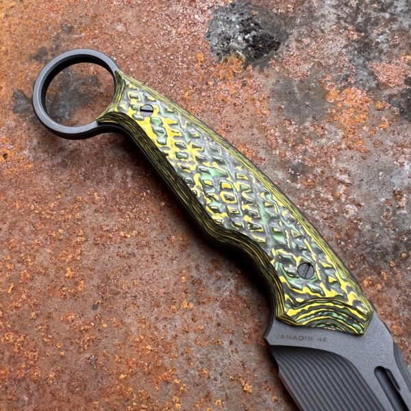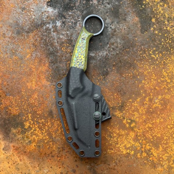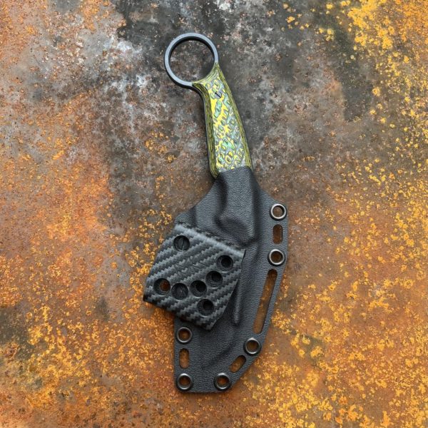 MK Knives & Tools Claw “Toxic Storm” comes with blade made of premium Vanadis 4 Extra steel, with innovative groove grind and with fuller. The blade has titanium PVD coating. Handle scales are made of exclusive Fat Carbon ‘Toxic Storm’. The knife comes with black Kydex holster equipped in carbon Holstex buckle.