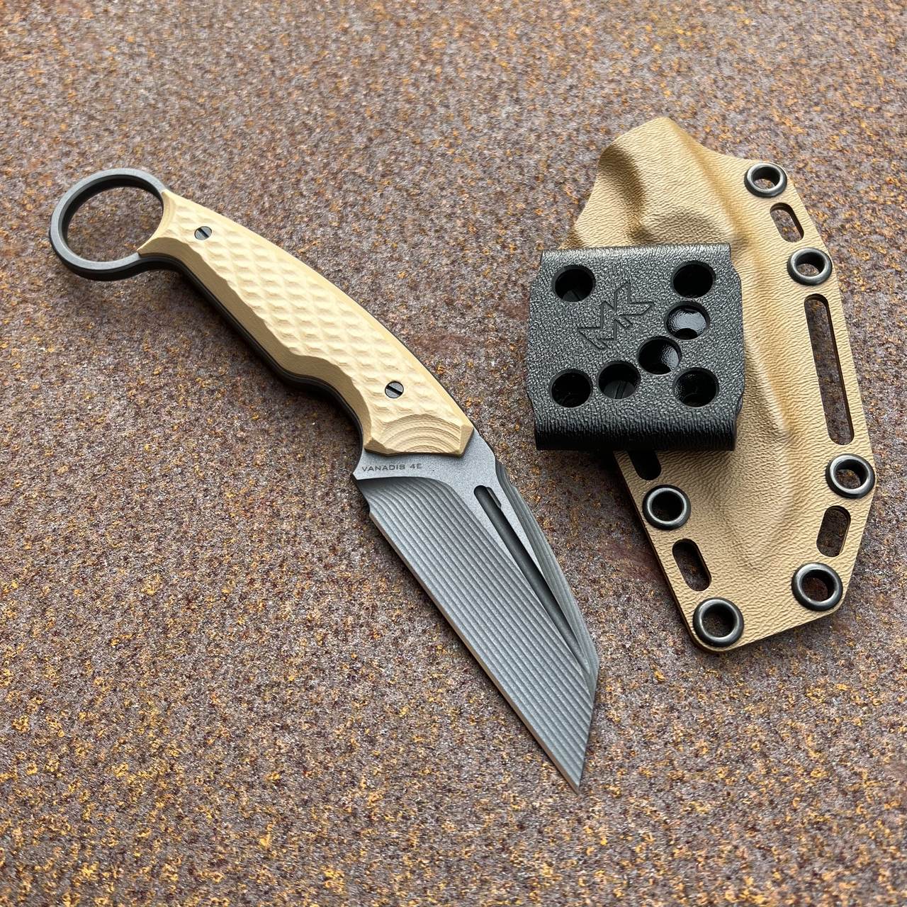MK Knives & Tools Claw “V-Serie #4” comes with blade made of premium Vanadis 4 Extra steel, with innovative groove grind and with fuller. The blade has titanium PVD coating. Handle scales are made of yellow/black G10 composite. The knife comes with black Kydex holster equipped in yellow Kydex buckle.