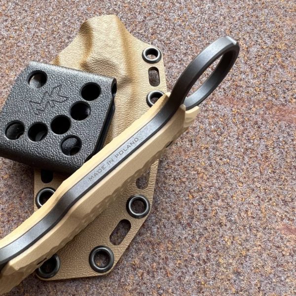 We attach the holster to the belt with the use of Kydex buckle. The initial mounting of the buckles allows the entire belt to be mounted vertically. However, it is possible to change the position of the buckles in a way that allows for more discreet horizontal installation (along the belt, on the back or at the front on the hip belt). Then just unscrew the buckles and change their arrangement. Strongly stable fastening (if we prefer it) can be obtained additionally by tying the holster through the through holes in it. Of course, you can use the paracord supply that the holster is wrapped in (its color corresponds to the section at the knife).