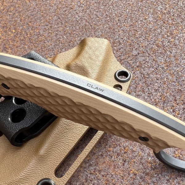 Claw is produced from different types of steel (Elmax, Vanadis 4 Extra, Vanadis 23 etc.), with different ways of finishing the blade (PVD coating, DLC coating, glassblasting, stonewash, satin). The handle is usually made of a G10 composite, micarta or carbon fiber with a variety of colors and different original patterns chosen by the knifemaker. For each knife, the knifemaker forms a suitable holster from kydex / holstex, whose colours (holster and accessories) match those of the blade and handle to make a consistent set.