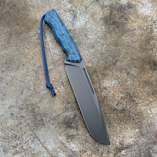 - Blade: fixed blade (full tang), drop point style blade with hollow grind (grooves), double-sided fuller, plain cutting edge