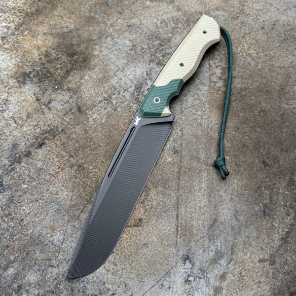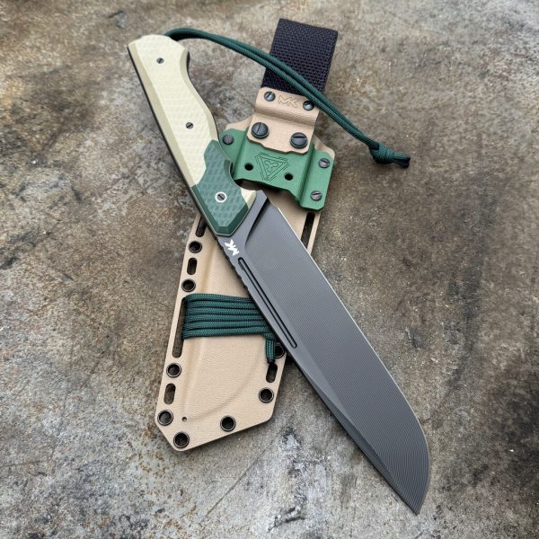 MK Knives & Tools Crowbar “FuturePunk” knife has a blade made of excellent European Elmax steel. The blade is made with an innovative, slightly hollow grind, visible as subtle grooves. This combination gives the tool incredible durability while maintaining excellent cutting properties. The flat of the upper part of the blade is additionally decorated with a delicate double-sided fuller. The blade is coated with a black DLC, and the handle is made from a G10 composite (Desert Tan base and green inserts). The knife comes with a Kydex sheath in Desert Tan with green accents.