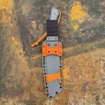 MK Knives & Tools Crowbar ‘Postapo’ knife in the version presented here features a blade made of Rigor steel with an impressively thick spine of 8 mm | 0.31″(!). The blade is crafted with an innovative, subtly hollow grind. This combination provides incredible durability while maintaining excellent cutting properties. The spine area of the blade is further distinguished by a double-sided fuller that smoothly transitions into a false edge (the type of fuller used here for the first time!). The blade is coated with a black DLC finish, and the handle is made of gray G10 with orange. The knife comes with a gray Kydex sheath.