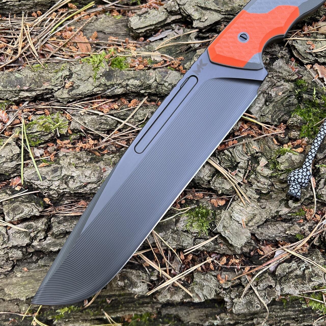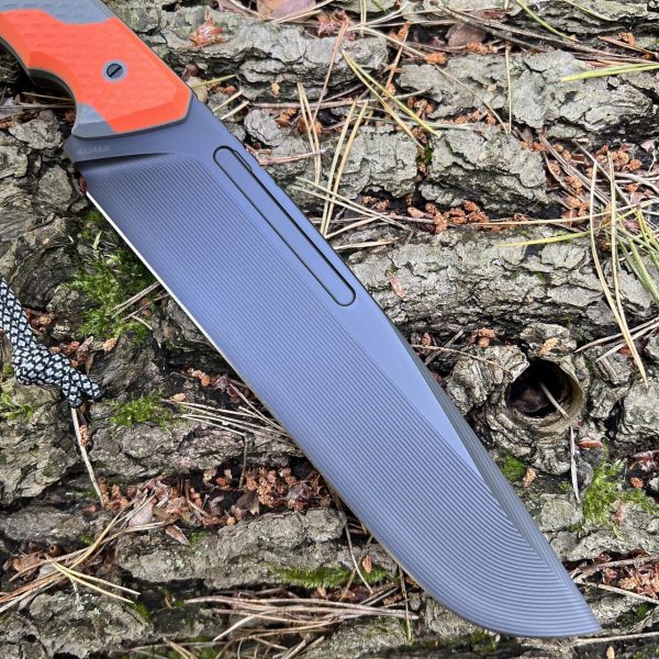 The knife blade has been profiled in the drop point style. This design helps to make the best use of the really large blade. It should be noted that the slightly curved design of the knife (arc from the end of the handle to the tip of the blade) in combination with a properly profiled, undercut handle gives the whole a more aggressive character and, if necessary, allows you to better use the force put into a sweeping cut when chopping, for example, a larger piece of wood, etc. A curiosity in the execution of the knife is the innovative hollow grind. It is visible at first glance in the form of characteristic grooves on both the correct blade and the false blade. The concavity of the grind is very subtle and, in addition to the visual effect, is designed to support the cutting process (it reduces the effect of the material sticking to the blade and facilitates splitting of the material).