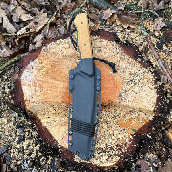 The holster can be carried in several ways. We attach it to the belt with a webbing grommet made of durable nylon. Mounting on a belt, but also on MOLLE solutions is ensured by an optional Kydex buckle added to the set*. The holster is equipped with through holes that can be used optionally to attach the set to a backpack or a tactical harness element with a rope, string or paracord. Of course, you can use a supply of paracord with which the holster is wrapped (its color corresponds to the section next to the knife).