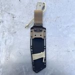 The presented knife features an excellent Elmax steel blade with a thickness of 6.5 mm in the back part. The blade is coated with a DLC coating and the handle is made of Desert Tan G10 composite with brown inserts. Included in the set is a black Kydex sheath with color accents.