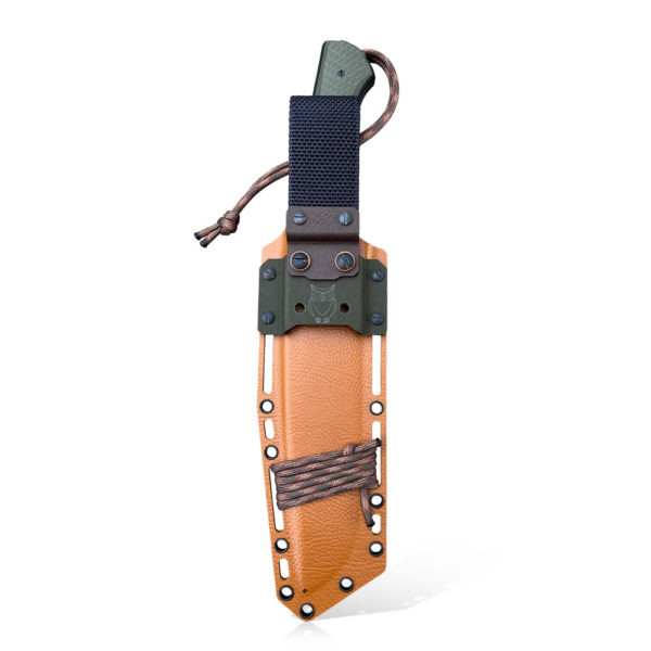 MK Knives & Tools Crowbar “Wood Spirit III” Knife has premium Elmax steel blade with excellent hard DLC coating. Grips are made of green G10 composite with black spacers of the same material and inserts made of stabilized wood. In the set with the knife we get a holstex holster in coyote color and kydex additions in black, brown and green. The set also includes an additional proprietary kydex buckle for attaching the knife to MOLLE solutions. The design of the holster is distinguished by pictograms engraved on the holster (owl, mushrooms, leaf) emphasizing the purpose of the knife – use in the bosom of nature.