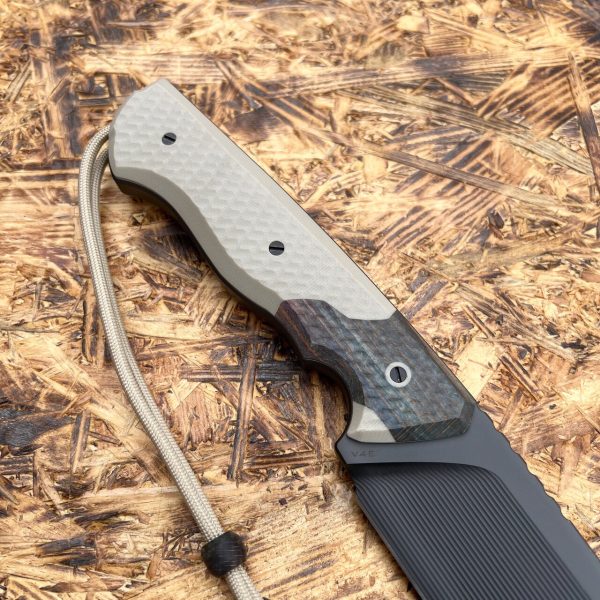 To enhance its resilience and protect against corrosion, the knife boasts a black DLC coating. This Diamond Like Carbon coating, boasting a remarkable hardness of approximately 90 HRC, fortifies the steel and enhances its anti-reflective properties.