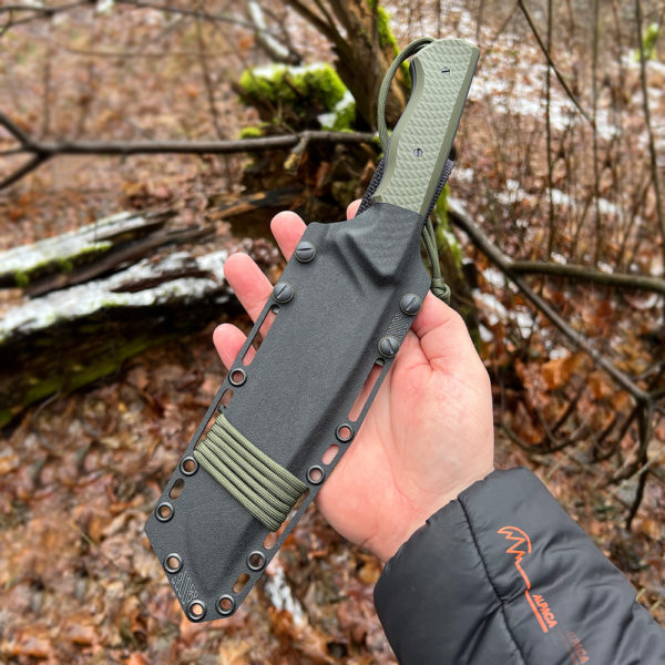 The holster can be carried in several ways. We attach it to the belt with a webbing grommet made of durable nylon. Mounting on a belt, but also on MOLLE solutions is ensured by an optional Kydex buckle added to the set*. The holster is equipped with through holes that can be used optionally to attach the set to a backpack or a tactical harness element with a rope, string or paracord. Of course, you can use a supply of paracord with which the holster is wrapped (its color corresponds to the section next to the knife).