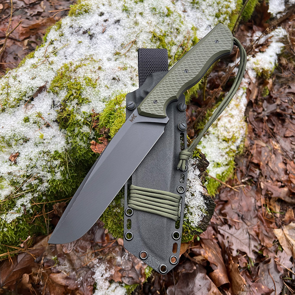 MK Knives & Tools Crowbar “Woodsman” knife comes with blade made of Vanadis 4 Extra steel with an impressive thickness of the tang 9 mm (0.35″) (!). The blade is made with an innovative, slightly hollow grind, visible as subtle grooves. This combination gives the tool incredible durability while maintaining great cutting properties. The blade was covered with a black PVD coating and the handle was made of olive G10 composite with black spacers. The set includes a black Kydex holster and an additional Kydex buckle for attaching the knife to MOLLE solutions.