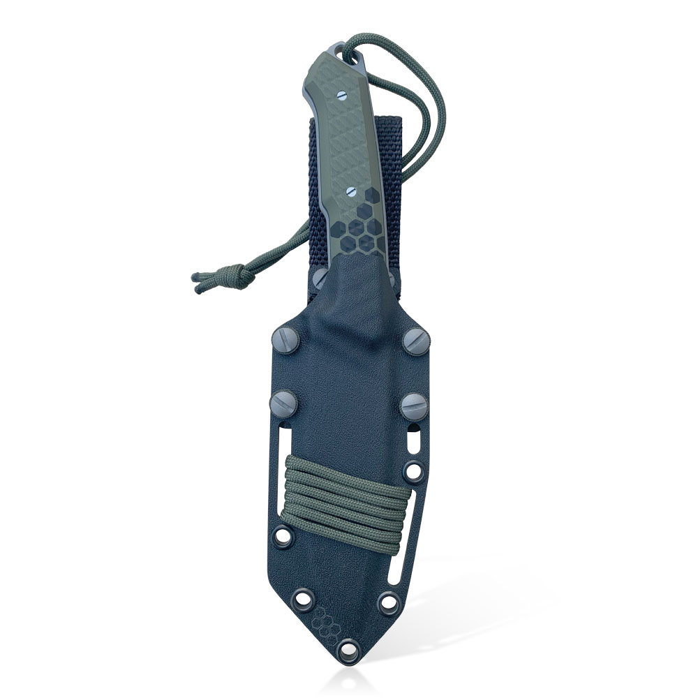 The ergonomic, revised shape of the handle is made of a very durable olive G10 with black expoxy inserts in honeycomb pattern. G10 is resistant to moisture, temperature changes, most solvents and acids and has high resistance to mechanical damage. In the presented knife the cover material has a rough pattern to prevent the handle from slipping in the hand. The handle covers have been screwed with sandblasted steel screws.