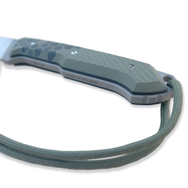 At the end of the knife handle there is a hole for attaching an additional wire, which can serve as a protection against dropping the knife during operation, or an additional gripper to facilitate the removal of the knife from the holster. Originally, it includes a paracord section with a shade matching the design.