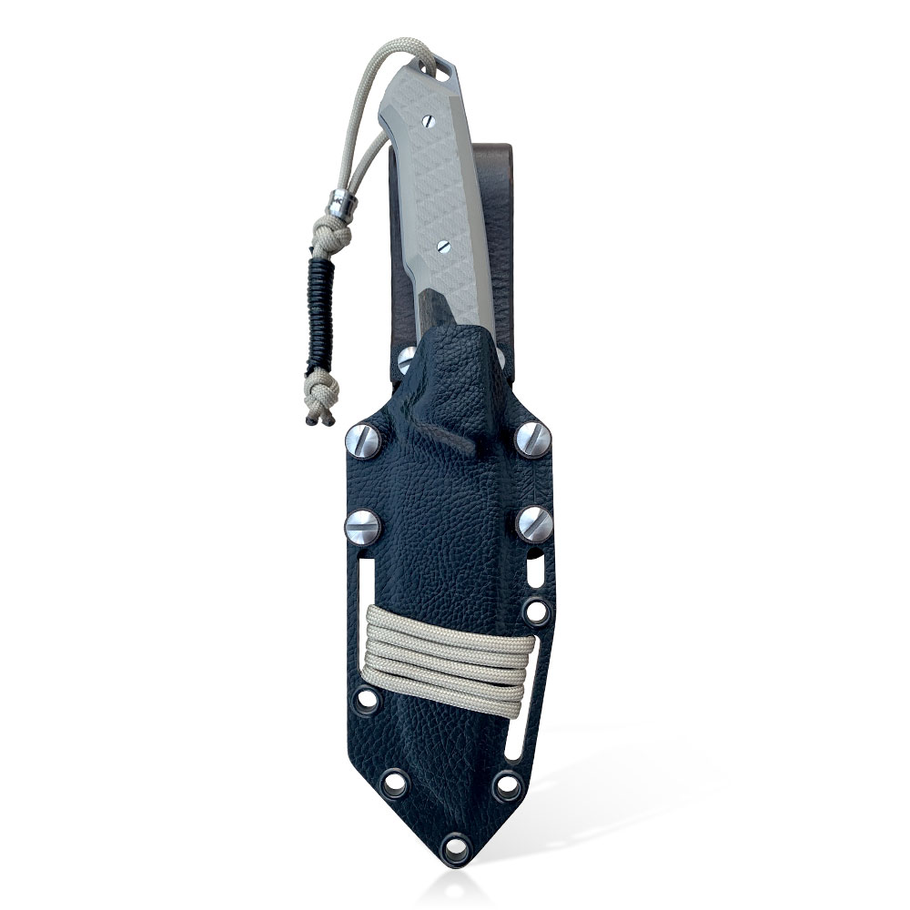 The knife has a holster made of hand-formed holstex material with a naturalistic texture, characterized by high impact and scratch resistance, characterized by low moisture absorption, resistant to various weather conditions and many chemicals. In the presented model, the holster is made of black material, supplemented with brown, Desert Tan and black accessories. The holster was twisted with steel, satin screws.
