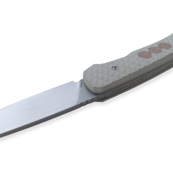 Grips made of G10 composite with micarta insert have a rough structure for better grip. G10 itself is resistant to moisture, temperature changes, most solvents and acids, has a high resistance to mechanical damage. The covers were screwed with stainless steel screws in a color consistent with the entire design (sandblasted). There is a hole in the backspacer that allows you to thread an additional rope, paracord, etc., which serve as protection against a possible loss of the knife. The hole can also be used to attach an additional ornament in the form of a bead (MK beads you will find HERE).