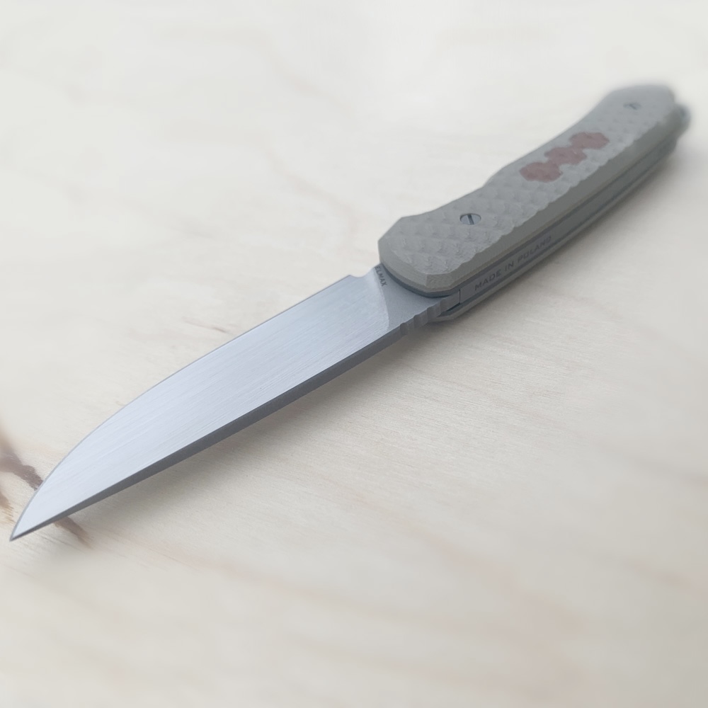 Humbler is a knife with a slipjoint design. The knife is opened with both hands, and the smooth movement of the blade is supported by phosphor bronze pads. The unfolded blade is stable and secure thanks to the perfect fit of the whole. Stability is also ensured by other structural elements. Each of them is matched in terms of shape and material. The construction is based on titanium liners, backspacer made of Elmax steel, and the pivot pin on which the blade moves is also made of the same steel. When the blade is closed, the carbide stoppin keeps it in the correct position.