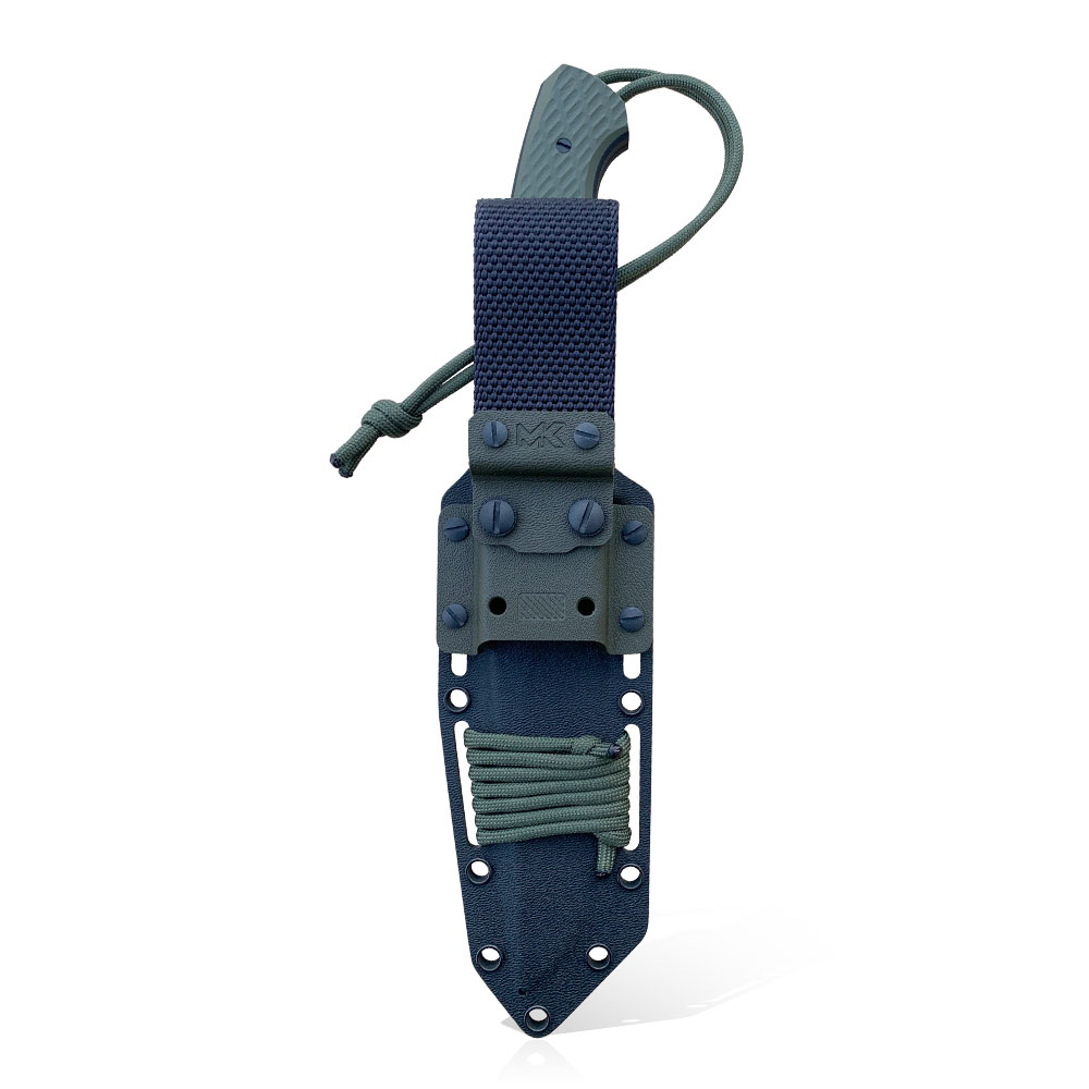 MK Knives & Tools Sentinel “Black & Olive” Knife | Vanadis 4 Extra | PVD has a unique design. The blade made of durable Vandis 4 Extra steel with excellent hardness (63 HRC), has been coated with a black, much thicker than in other MK Knives & Tools models (you can find them HERE), PVD coating. The innovative construction of the handle combines the advantages of full tang and hidden tang construction. The wide shank of the knife runs along the entire length of the handle (as in the full tang), but it has been enclosed with G10 composite covers screwed on it (as in the hidden tang). This construction gives us the same durability as in the classic full tang, but it is more pleasant for a hand working in the cold without a glove, as in the case of hidden tang knives. The presented knife has hole for paracord (rope etc.) designed at the end of the handle. The knife set comes with kydex holster and additional buckle designed for mounting to the MOLLE system.