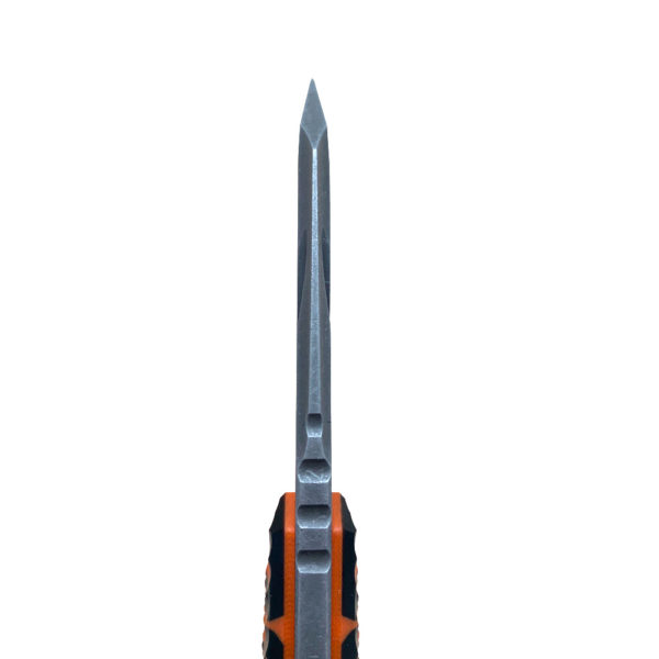 The presented MK-05 Claw knife has a blade made of premium Elmax steel, with a very interesting double grind (characteristic grooves on the blade) and a fuller, a handle made of durable G10 composite (orange color with black epoxy inserts), and a black holtstex holster with a carbon fiber pattern (carbon). The holster can be mounted vertically or horizontally or at a selected angle thanks to a specially adapted orange kydex buckle.