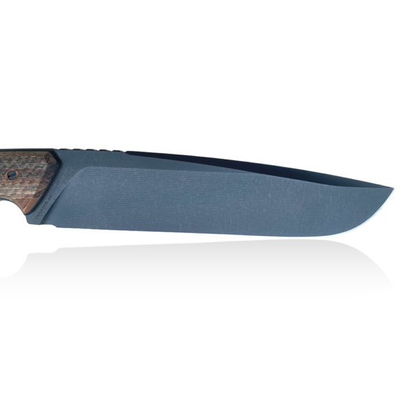 The knife blade has been profiled in the drop point style. This design helps to make the best use of the really large blade. It should be noted that the slightly curved design of the knife (arc from the end of the handle to the tip of the blade) in combination with a properly profiled, undercut handle gives the whole a more aggressive character and, if necessary, allows you to better use the force put into a sweeping cut when chopping, for example, a larger piece of wood, etc. A curiosity in the execution of the knife is the innovative hollow grind. It is visible at first glance in the form of characteristic grooves on both the correct blade and the false blade. The concavity of the cut is very subtle and, in addition to the visual effect, is designed to support the cutting process (it reduces the effect of the material sticking to the blade and facilitates splitting of the material).