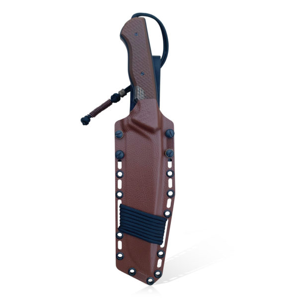The knife has a holster made of hand-formed Holstex® material with a naturalistic texture, characterized by high impact and scratch resistance, characterized by low moisture absorption, resistant to various weather conditions and many chemicals. In the presented model, the holster is made of brown material, supplemented with coyote and black kydex accessories.