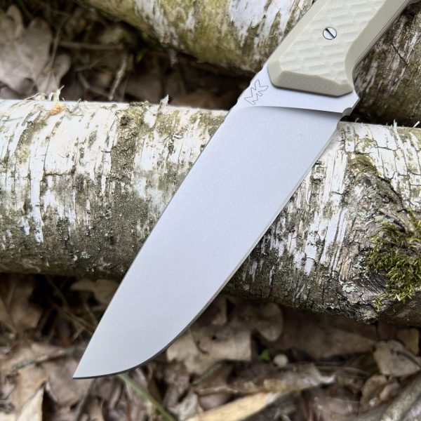 - Blade: fixed blade (full tang), drop point style with flat grind (FFG – Full Flat Grind), plain cutting edge