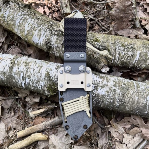 MK Knives & Tools Nomad “Ashen” knife features high-quality Elmax steel, renowned for its exceptional performance. The handle is crafted from Desert Tan G10 composite, providing durability and a comfortable grip. The knife is accompanied by a grey Kydex sheath for secure storage and easy carry.