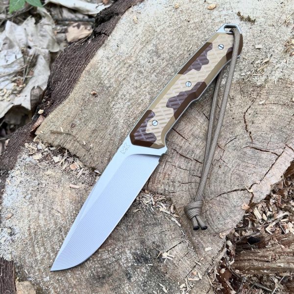 MK Knives & Tools Nomad “Camo #1” knife features high-quality Elmax steel, renowned for its exceptional performance. The blade is designed with a groove grind (GG/hollow) to enhance cutting efficiency. The handle is crafted from G10 composite, providing durability and a comfortable grip. The handle scales showcase a custom camo pattern, combining coyote and brown colors for a unique aesthetic.The knife is accompanied by a coyote Kydex sheath for secure storage and easy carry.