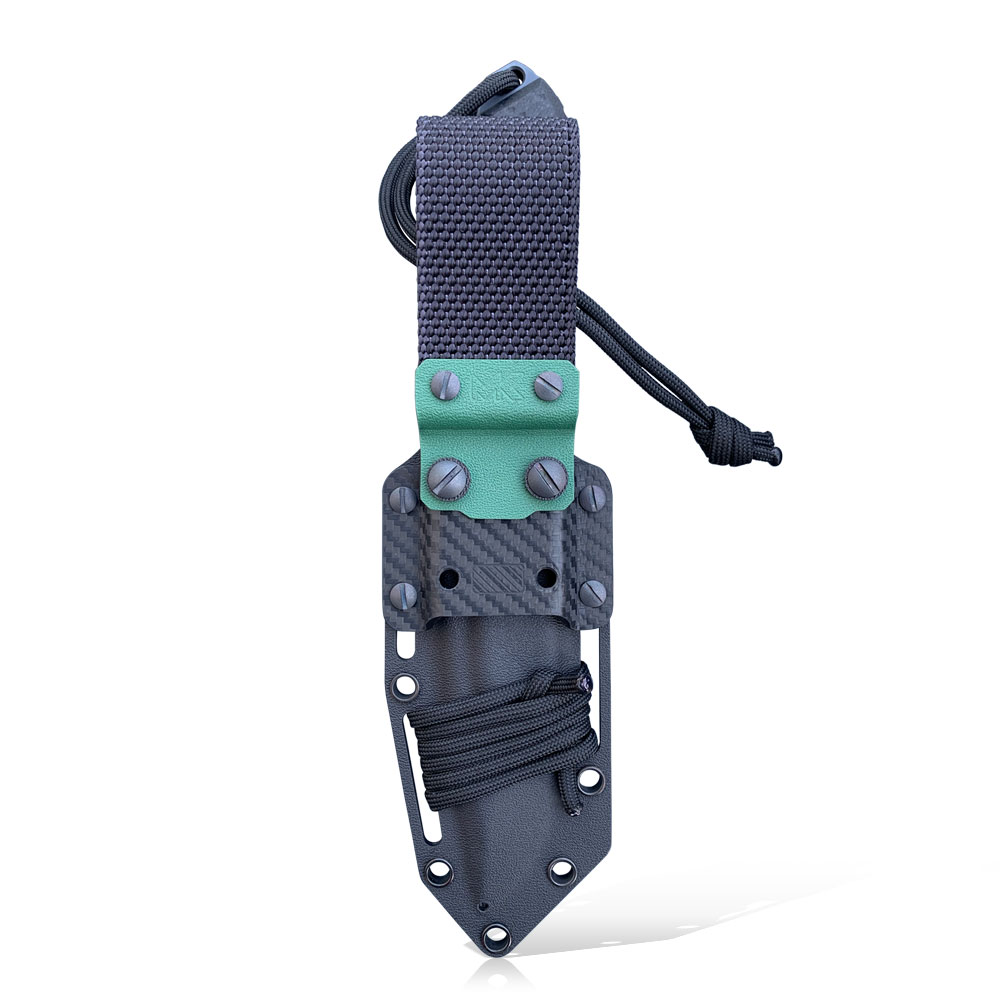 We attach the holster to the belt with the use of kydex buckles, which can also be attached to MOLLE solutions. The initial mounting of the buckles allows the entire belt to be mounted vertically. However, it is possible to change the position of the buckles in a way that allows for more discreet horizontal installation (along the belt, on the back or at the front on the hip belt). Then just unscrew the buckles and change their arrangement. Strongly stable fastening (if we prefer it) can be obtained additionally by tying the holster through the through holes in it. Of course, you can use the paracord supply that the holster is wrapped in (its color corresponds to the section at the knife).
