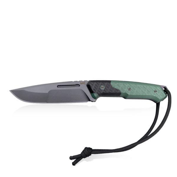 The ergonomic, revised shape of the handle is made of a very durable olive G10. G10 is resistant to moisture, temperature changes, most solvents and acids and has high resistance to mechanical damage. In the presented knife the cover material has a rough pattern to prevent the handle from slipping in the hand. The handle covers have been screwed with PVD coated steel screws.