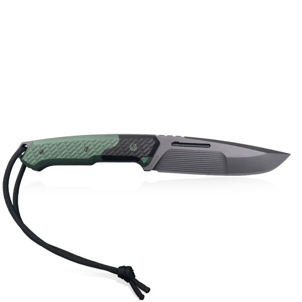At the end of the knife handle there is a hole for attaching an additional wire, which can serve as a protection against dropping the knife during operation, or an additional gripper to facilitate the removal of the knife from the holster. Originally, it includes a paracord section with a shade matching the design.