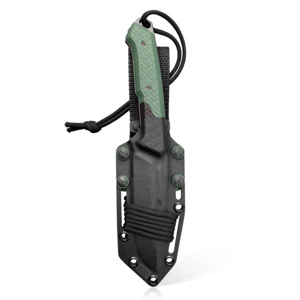 The knife has a holster made of hand-formed kydex material, which is characterized by high impact and scratch resistance, characterized by low moisture absorption, resistant to various weather conditions and many chemicals. In the presented model, the holster is made of black material and color additions, the same color which we can find at the handle material.