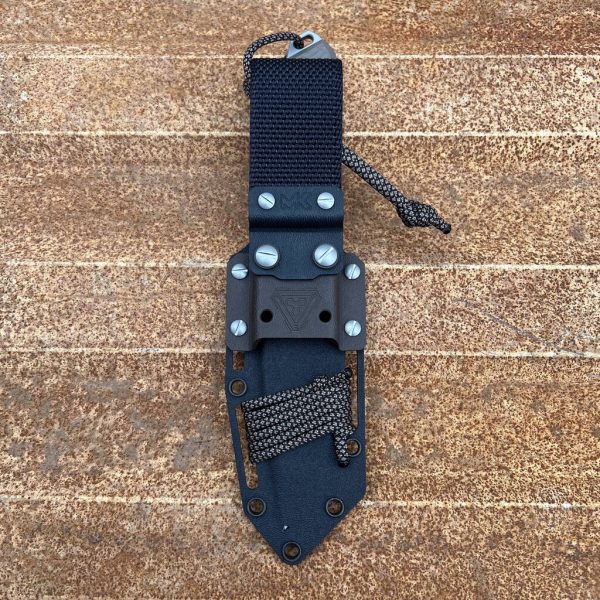 The holster is attached to the belt using a textile loop. It is equipped with pass-through holes that can be optionally used to secure the holster to a backpack or tactical gear using cordage, rope, or paracord. The holster is wrapped with paracord, matching the color of the section near the knife.