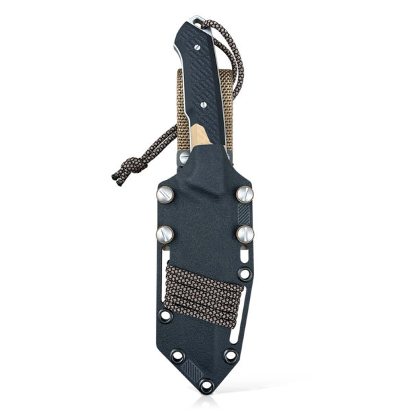The holster can be carried in several ways. We attach it to the belt with a webbing grommet made of durable nylon. Mounting on a belt, but also on MOLLE solutions is ensured by an optional Kydex buckle added to the set*. The holster is equipped with through holes that can be used optionally to attach the set to a backpack or a tactical harness element with a rope, string or paracord. Of course, you can use a supply of paracord with which the holster is wrapped (its color corresponds to the section next to the knife).