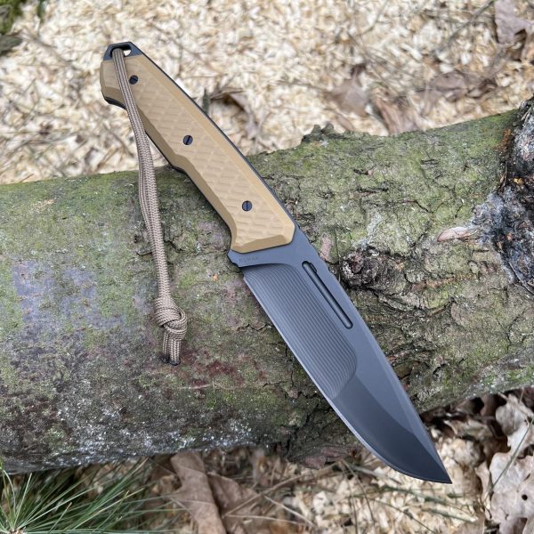 - Blade: fixed blade (full tang), drop point style with double grind and fuller (DGFF), plain cutting edge