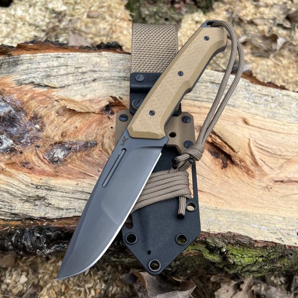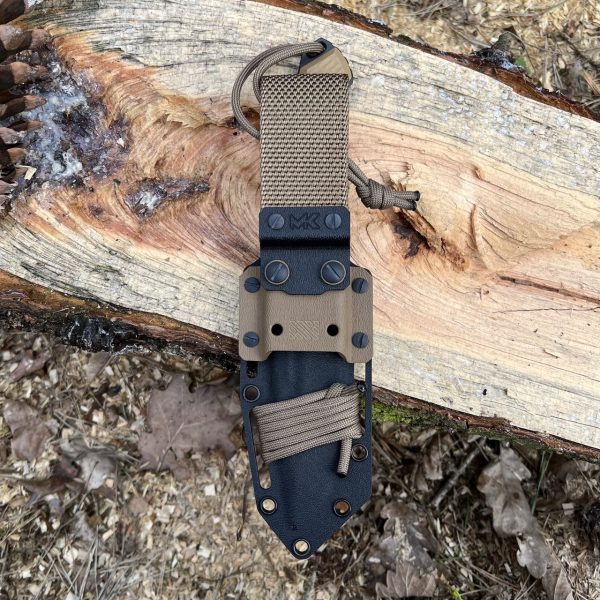 MK Knives & Tools Nomad “L6 #4” knife comes with premium Elmax steel in DLC coating. The blade comes with double grind anf double-sided fuller in the spine area (DGFF / Doubl Grine Fuller False [blade]) which improves cutting properties. The handle is made of Coyote Brown G10 composite. Knife comes with black Kydex sheath with. Kydex can be mounted vertically or horizontally (along the belt, which allows for discreet carrying). It is also adapted to mounting at MOLLE solutions, thanks to a specially designed, additional Kydex buckle which also comes in set.