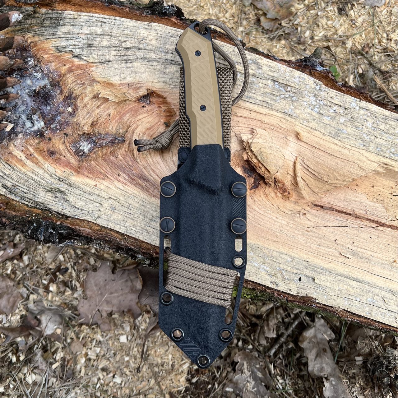 The holster can be carried in several ways. We attach it to the belt with a webbing grommet made of durable nylon. Mounting on a belt, but also on MOLLE solutions is ensured by an optional Kydex buckle added to the set*. The holster is equipped with through holes that can be used optionally to attach the set to a backpack or a tactical harness element with a rope, string or paracord. Of course, you can use a supply of paracord with which the holster is wrapped (its color corresponds to the section next to the knife).