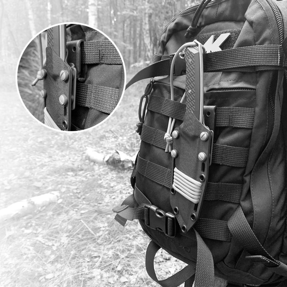 The holster can be carried in several ways. We attach it to the belt with a webbing grommet made of durable nylon. Mounting on a belt, but also on MOLLE solutions is ensured by an optional Kydex buckle added to the set*. The holster is equipped with through holes that can be used optionally to attach the set to a backpack or a tactical harness element with a rope, string or paracord. Of course, you can use a supply of paracord with which the holster is wrapped (its color corresponds to the section next to the knife).