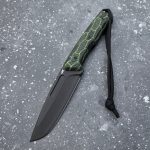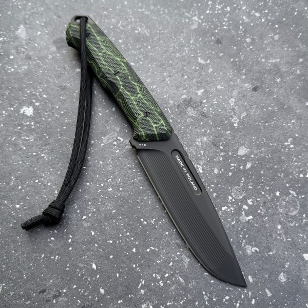 In this presented version, the Nomad features a blade made of Vanadis 4 Extra steel with black DLC coating. The knife blade with a drop point profile has been grooved (hollow grind) to obtain better cutting properties, and its tip is characterized by a flat grind emphasizing the penetrating abilities of the knife. The blade near the spine is decorated with a double-sided fuller, reducing the weight of the blade. The 4 mm (0.14″) thick blade, combined with steel that is particularly resistant to heavy loads, offers excellent cutting performance while maintaining durability during demanding use. The handle scales are made of a fancy G10 composite that resembles a turtle shell in green and black colors. The nuances on the blade, bright inserts in the handle, and the pictograms on the sheath are characteristic of the ‘Postapo’ series. The set includes a black sheath made from carbon Holstex.