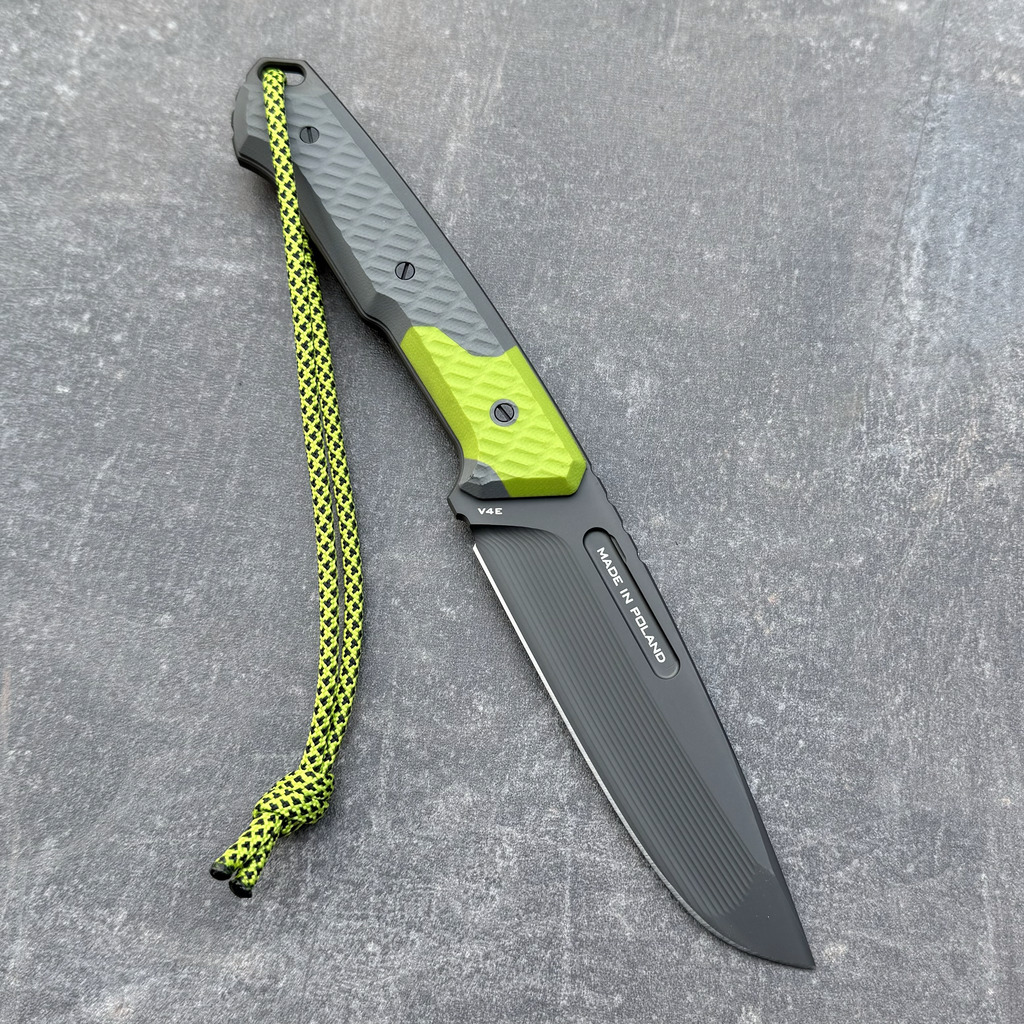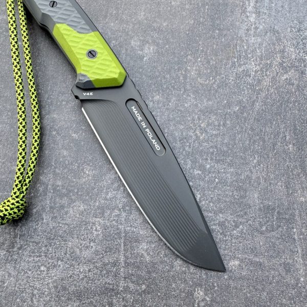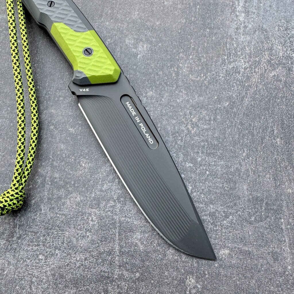 In this presented version, the Nomad features a blade made of Vanadis 4 Extra steel with black DLC coating. The knife blade with a drop point profile has been grooved (hollow grind) to obtain better cutting properties, and its tip is characterized by a flat grind emphasizing the penetrating abilities of the knife. The blade near the spine is decorated with a double-sided fuller, reducing the weight of the blade. The 4 mm (0.14″) thick blade, combined with steel that is particularly resistant to heavy loads, offers excellent cutting performance while maintaining durability during demanding use. The handle scales are made of a grey G10 composite with toxic green inserts. The nuances on the blade, bright inserts in the handle, and the pictograms on the sheath are characteristic of the ‘Postapo’ series. The set includes a black sheath made from carbon Holstex with color additions.