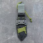 The holster is attached to the belt using a textile loop. It is equipped with pass-through holes that can be optionally used to secure the holster to a backpack or tactical gear using cordage, rope, or paracord. The holster is wrapped with paracord, matching the color of the section near the knife.
