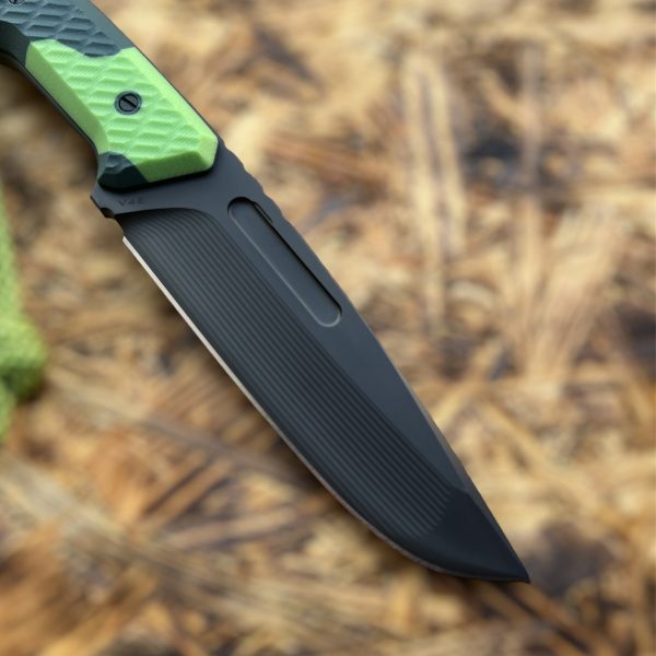 The knife blade has been profiled in the drop point style with innovative groove grind (GG / hollow). It is visible at first glance in the form of characteristic grooves on both the correct blade and the false blade. The concavity of the cut is very subtle and, in addition to the visual effect, is designed to support the cutting process (it reduces the effect of the material sticking to the blade and facilitates splitting of the material).