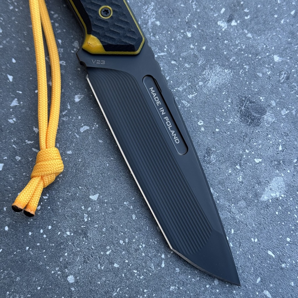 **The 4 mm (0.14″) thick blade combined with particularly resistant to overload steel provides excellent cutting properties and resistance during demanding use. The handle linings are made of yellow G10 composite with black G10 inserts. The set includes a black holster made of carbon Holstex with purple additions. The nuances on the blade, the colors of the handle and the pictograms on the holster are characteristic of the “Postapo” series.