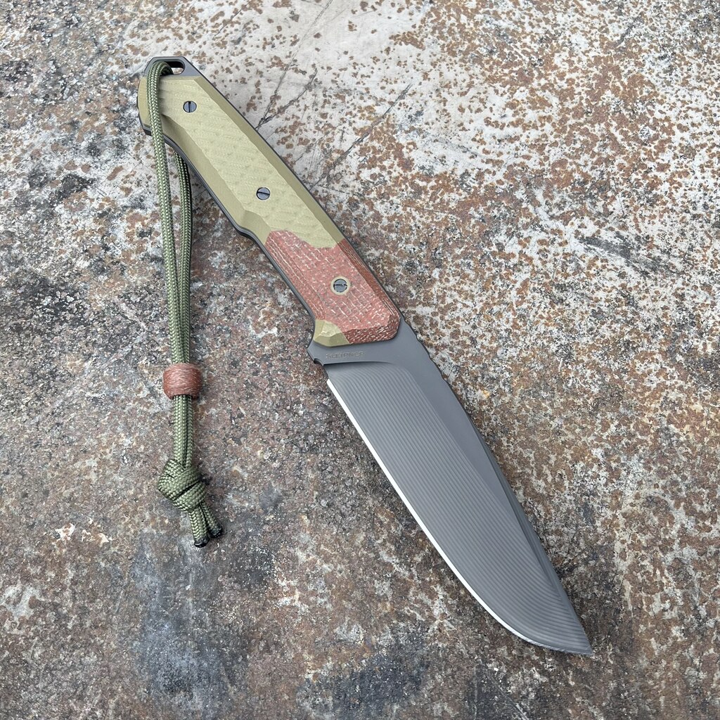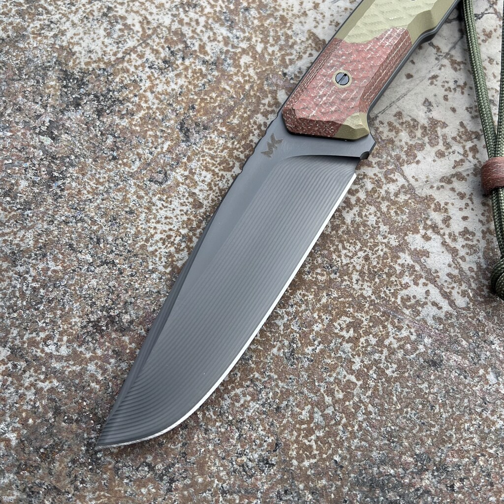 - Blade: fixed blade (full tang), drop point style with groove grind (GG / hollow), plain cutting edge