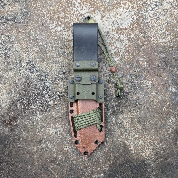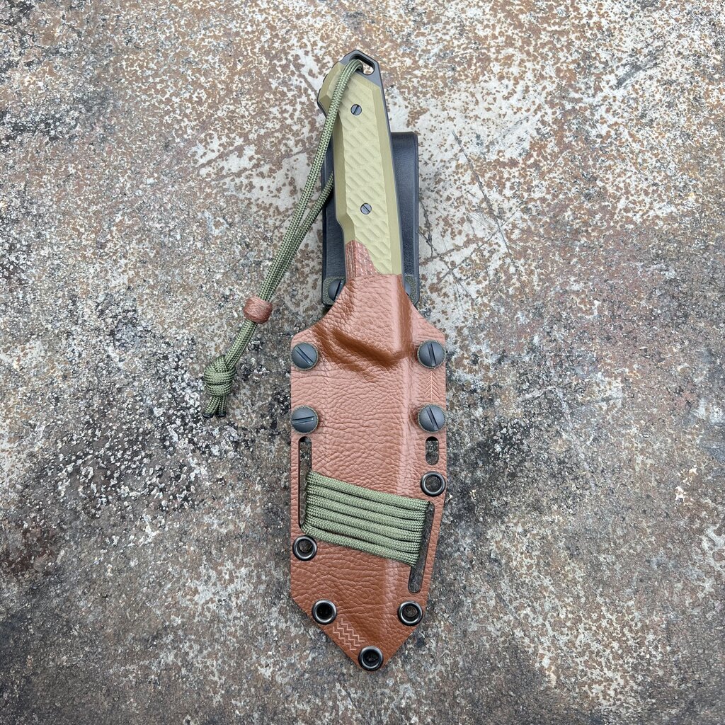 Easy Attachment Options: The holster conveniently attaches to your belt using a leather loop. Equipped with pass-through holes, it offers the flexibility to secure it to a backpack or tactical harness using cordage, paracord, or even a paracord section matching the knife’s design.
