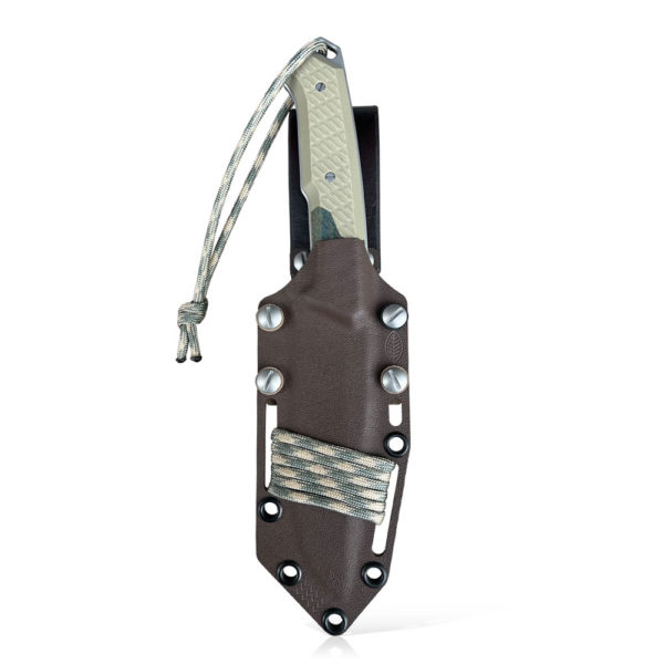 At the end of the knife handle there is a hole for attaching an additional wire, which can serve as a protection against dropping the knife during operation, or an additional gripper to facilitate the removal of the knife from the holster. Originally, it includes a paracord section with a shade matching the design.