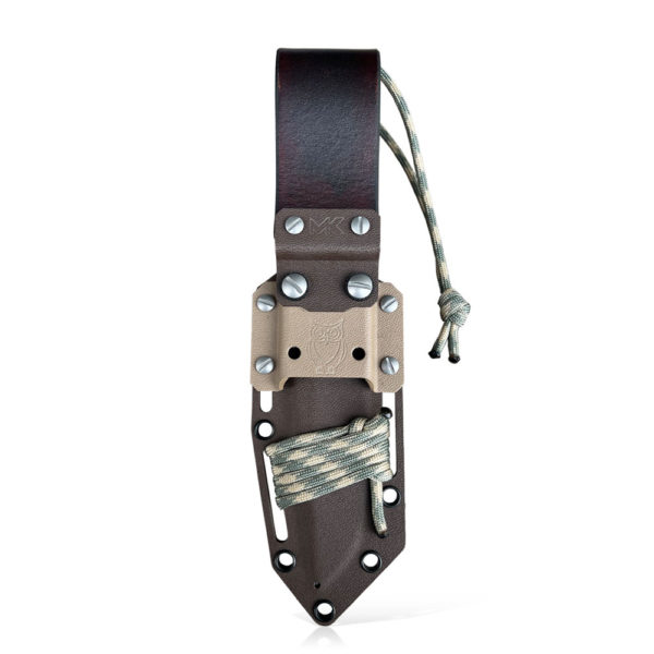 MK Knives & Tools Nomad “Wood Spirit II” has a blade made of the highest quality Vanax steel with an innovative hollow grind (grooves on the blades) and a glassblasted finish. The knife has a Desert Tan G10 composite handle with stabilized wood inserts. The set includes a brown kydex holster decorated with pictograms (owl, river, leaf), enriched with color-matched accessories. The holster is also distinguished by a brown natural leather grommet. The holster can be mounted to MOLLE solutions, thanks to the additional, specially designed kydex buckle included in the set.