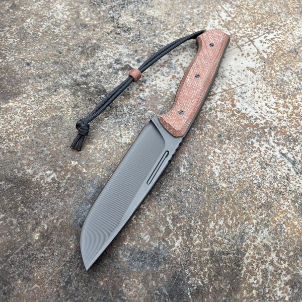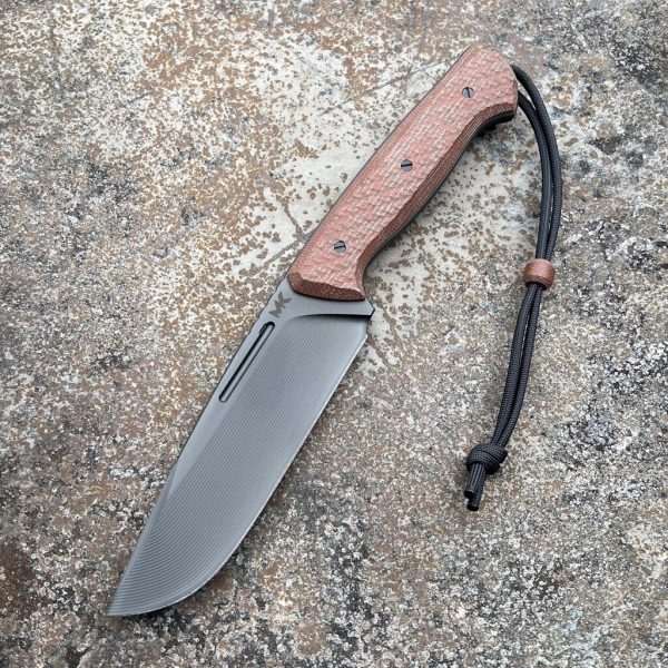 The handle scales, with an ergonomic, contoured shape, are made of custom micarta. Micarta is a material that is resistant to moisture, temperature changes, most solvents and acids, and has high resistance to mechanical damage. In the presented knife, the handle scales feature a milled pattern to prevent slipping in the hand. The handle scales are secured with stainless steel screws matching the blade’s finish.
