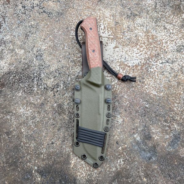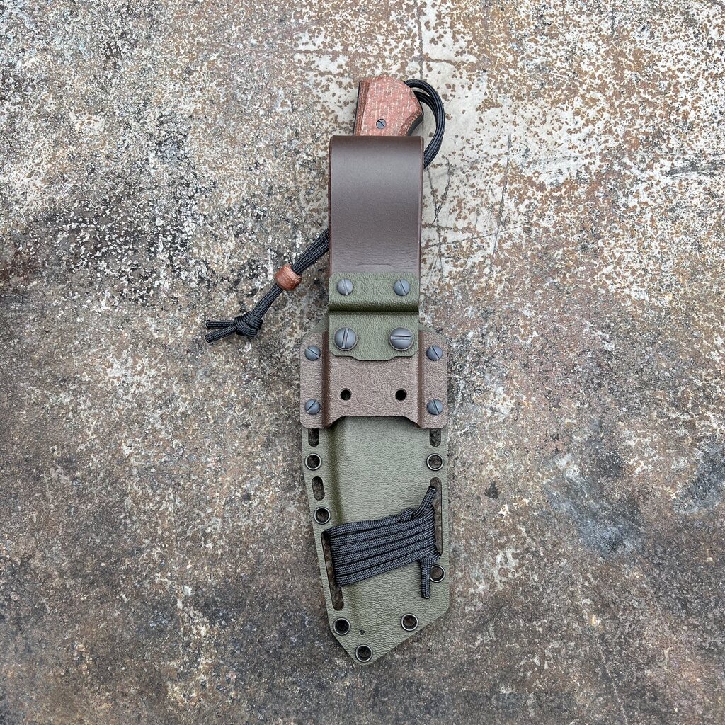 The holster is attached to the belt using a tleather loop. It is equipped with pass-through holes that can be optionally used to secure the holster to a backpack or tactical gear using cordage, rope, or paracord. The holster is wrapped with paracord, matching the color of the section near the knife.